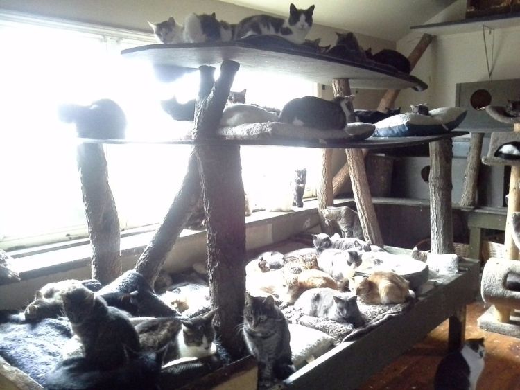Happy Cat Sanctuary takes the cats’ preferences into consideration, allowing those who want to come inside to find all kinds of shelves and trees to climb on. Cats that prefer to be outside are provided with heated spaces to keep warm.