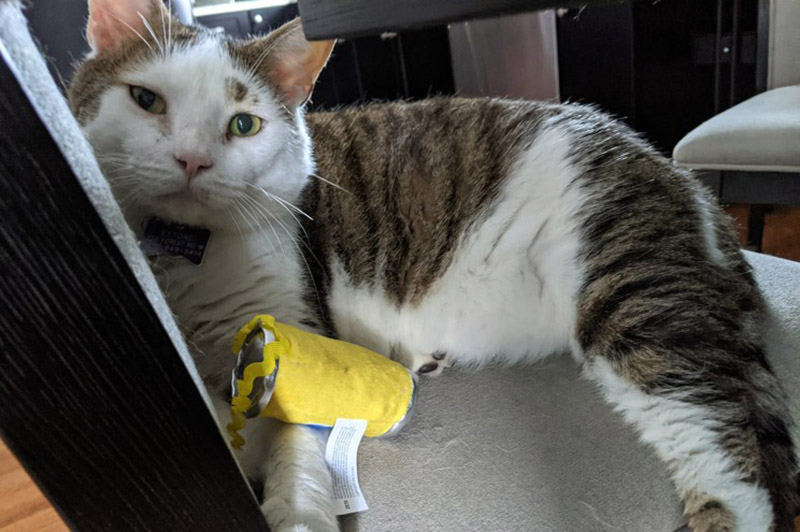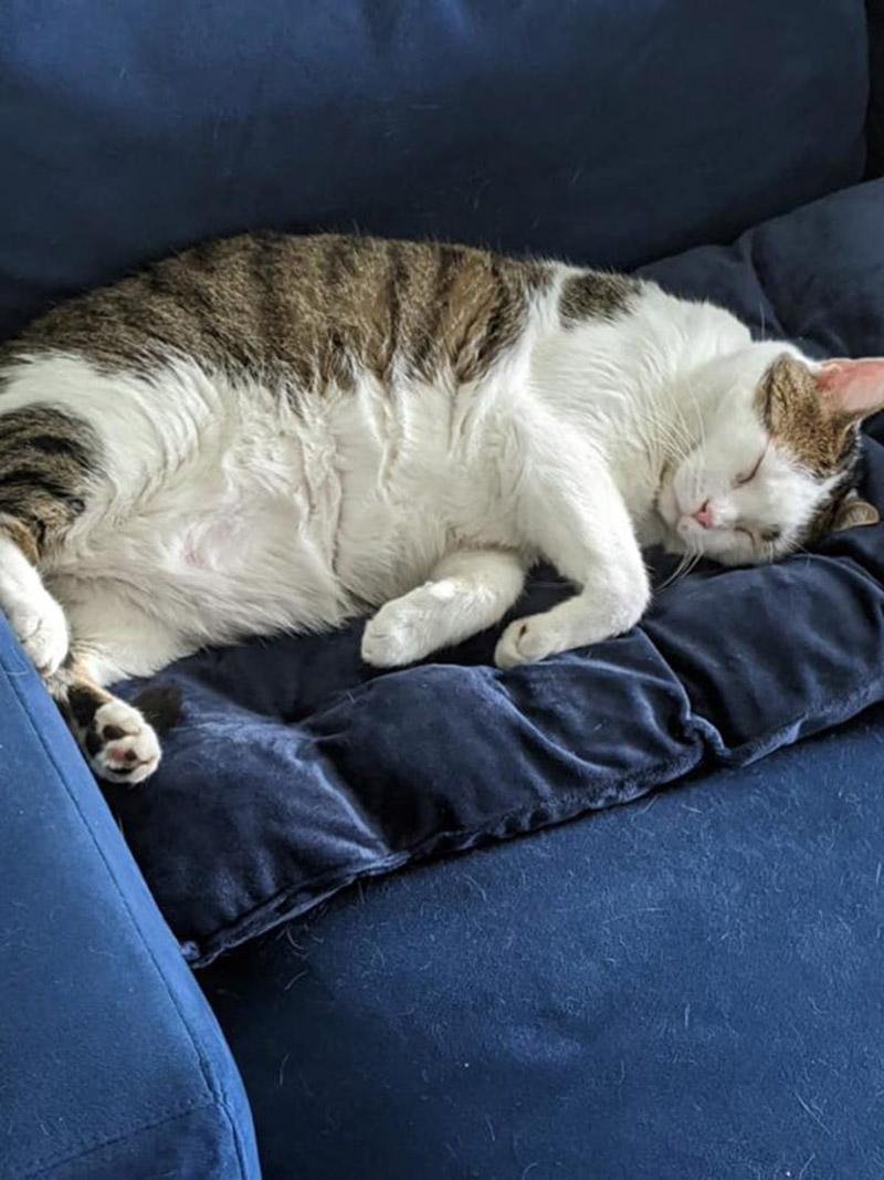 After three weeks of dedicated searching, Debacker finally trapped the cat safely. Three pounds had melted away from his 17-pound frame and his nose was also a bit scratched up. Fortunately, he was otherwise healthy and safe. He was “visibly scared” to begin with but soon warmed up to him.