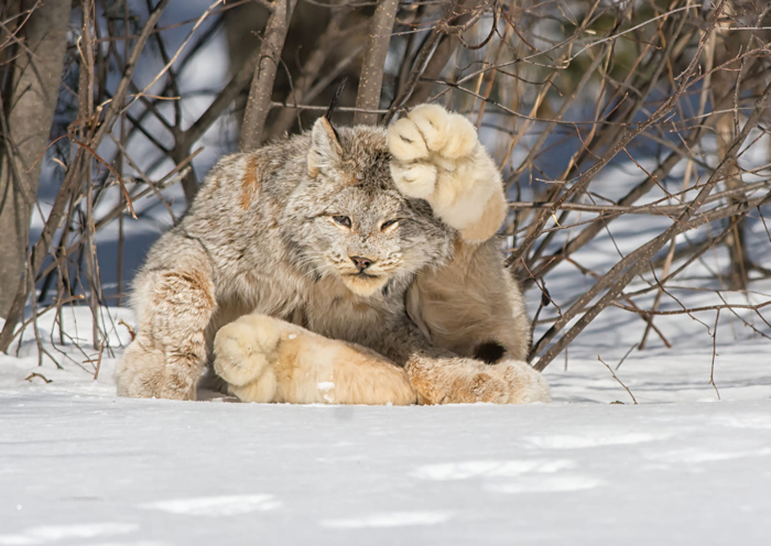 Having big eyes and advanced hearing, the Canada lynx excels at night hunting. However, since they can’t run very fast, these creatures have to make up for it with sneaky tactics when it comes to catching prey. A common one is finding a hiding spot and waiting for prey to come near them. Then they pounce. Sometimes they sit still for hours just to catch a bite.