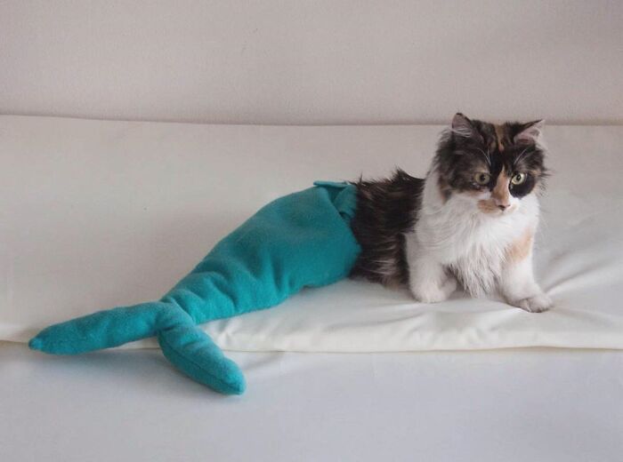 However, none of that stops the sweet kitty from living her best life as a house cat and a mermaid
