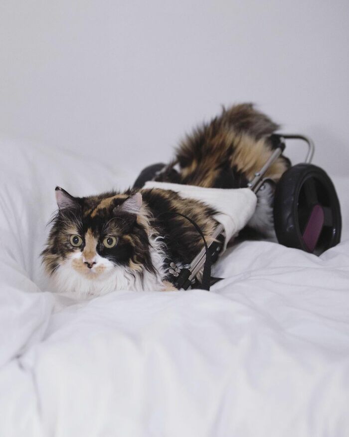 “I have to make sure I empty her bladder manually at least three times a day and make sure she has room to move around on her own without getting stuck. So yeah, it is a lot of responsibility and work but the reward of seeing her happy, of hearing her purr when we cuddle, and of seeing her ‘running’ around the house to her favorite sunbathing spots makes it all worth it.”
