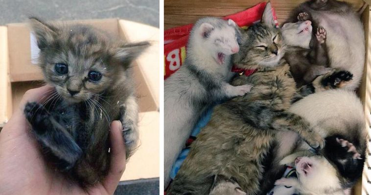 An abandoned kitten was found when she was only five months old. She was adopted by a family who named her Komari and was taken home to meet the rest of the family, who happened to be ferrets!