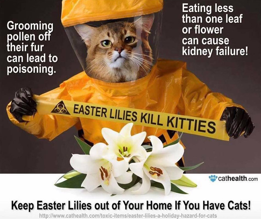 Lilies are one of the most dangerous flowers on earth for our cats. What’s truly scary is that one little nibble or lick has the ability to send a cat into acute kidney failure. These ornamental flowering plants are widely used in holiday celebrations, weddings, funerals, and especially popular for floral arrangements during Easter.