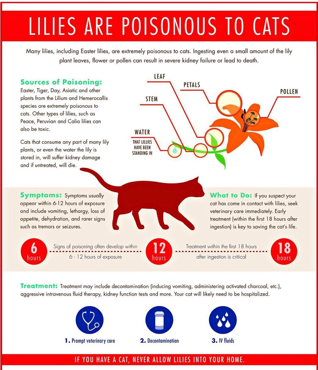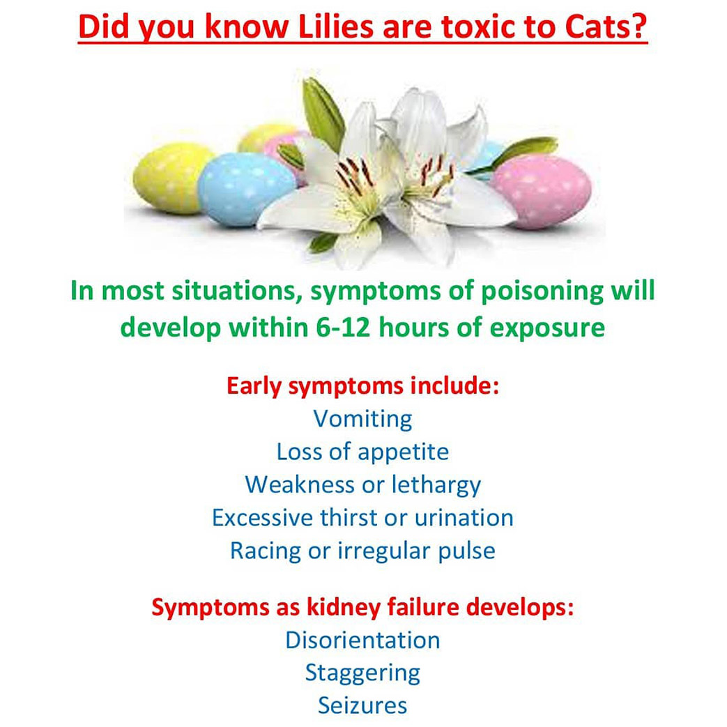 A single flower has been known to cause death, even the pollen is deadly! In cats, clinical signs include salivation, vomiting, anorexia, and depression.