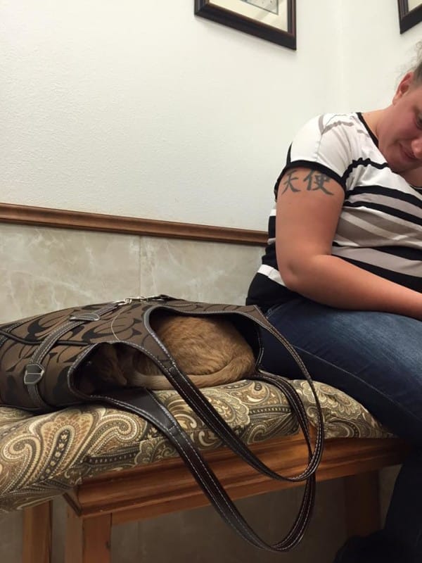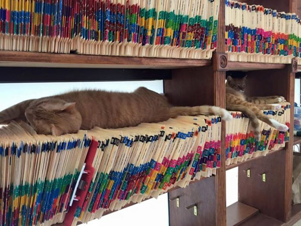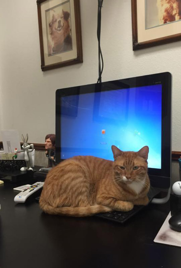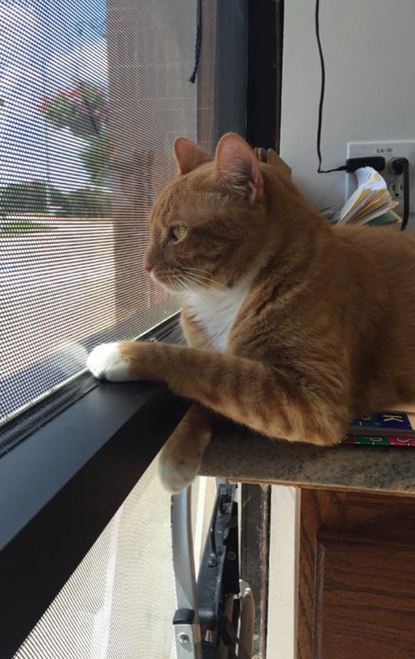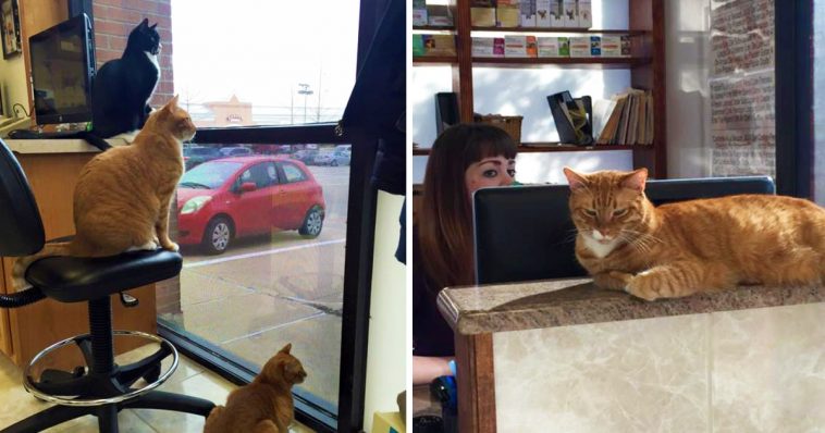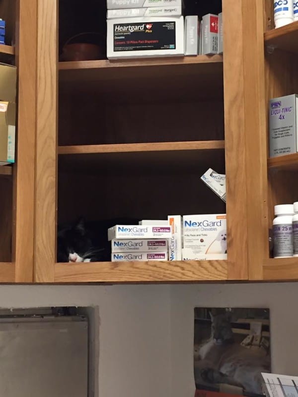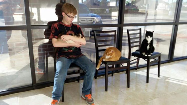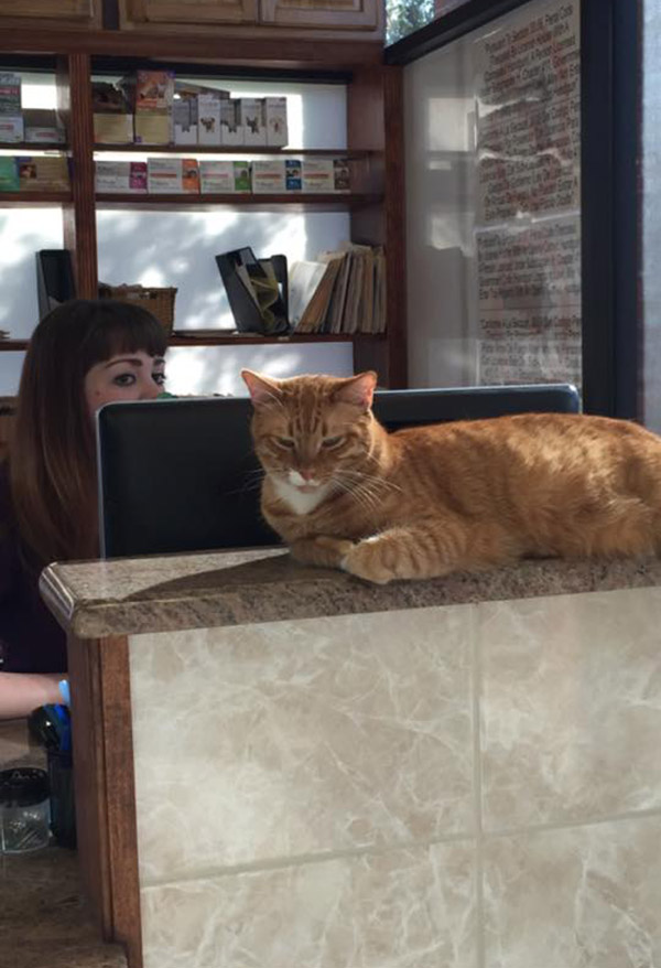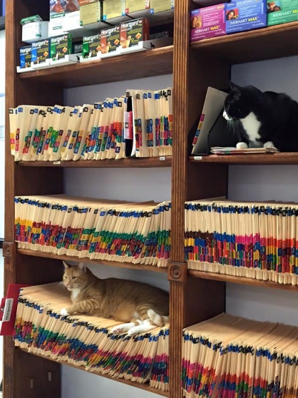These three kittens, Larry, Roger and Carl were once abandoned in Texas. Luckily someone rescued them, and brought all of them to Mercy Animal Clinic. Three years have passed, and now they’re grown up, and are permanent residents of the clinic. They are now the clinic’s official welcoming committee. They are the feline staffers that keep things calm and carrying!