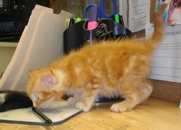He may not be able to see. But, that doesn’t stop him from inspecting all things on the desk with his heightened sense of smell.