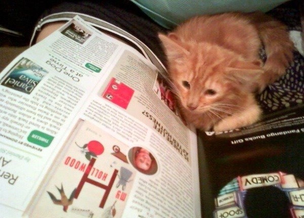 Nope, he can’t see the magazine, but he definitely hears every time a page flips.