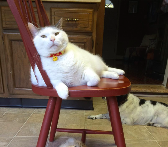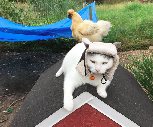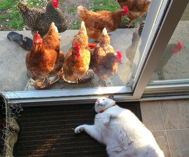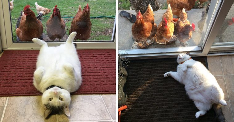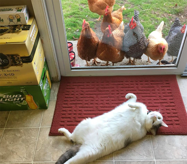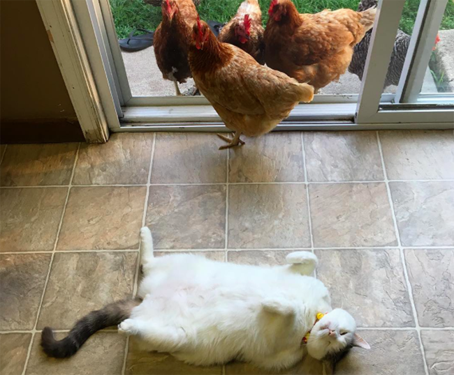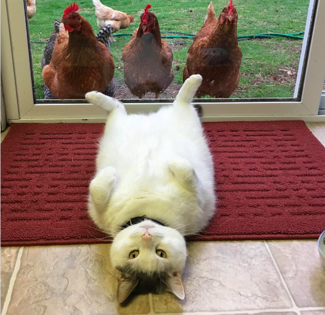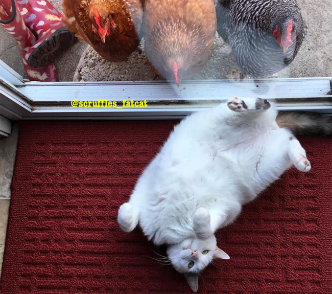 This is Scruffles. He’s a chubby cat, and likes to just lay around all day. He also has fan club of pet chickens, who love nothing more than to watch him do nothing all day long.