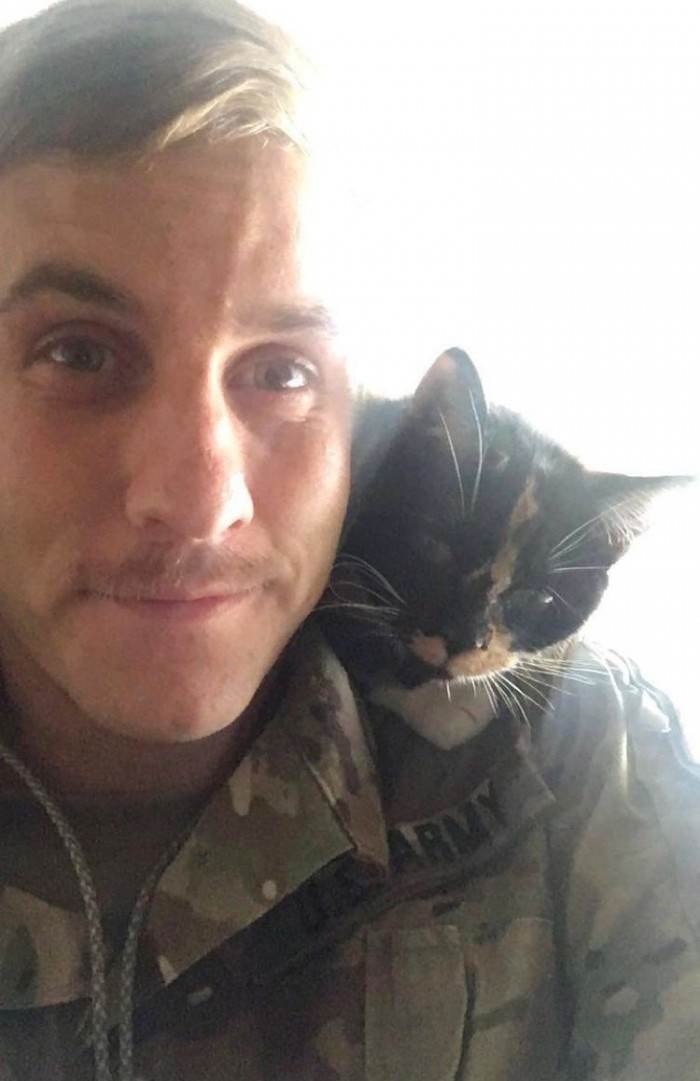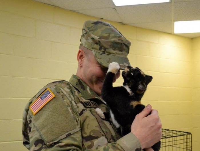 “I opened the cage, picked her up and that was it. She started meowing the most pathetic little chirps as she pushed her face to the brim of my cap (this is when they got the picture), only to be backed by a rumble of purring. I turned into a huge sap,” he said.