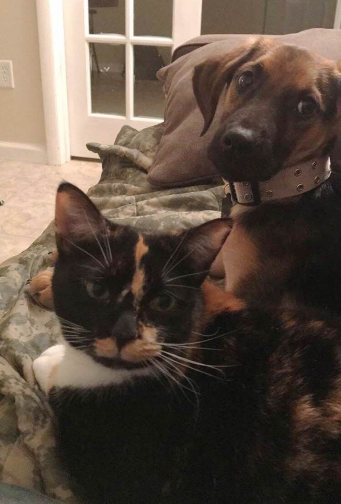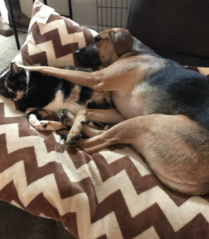 About six months after he adopted Barb, he went back and adopted Rupert the dog. They soon became inseparable friends and spend most of their time playing and snuggling each other.