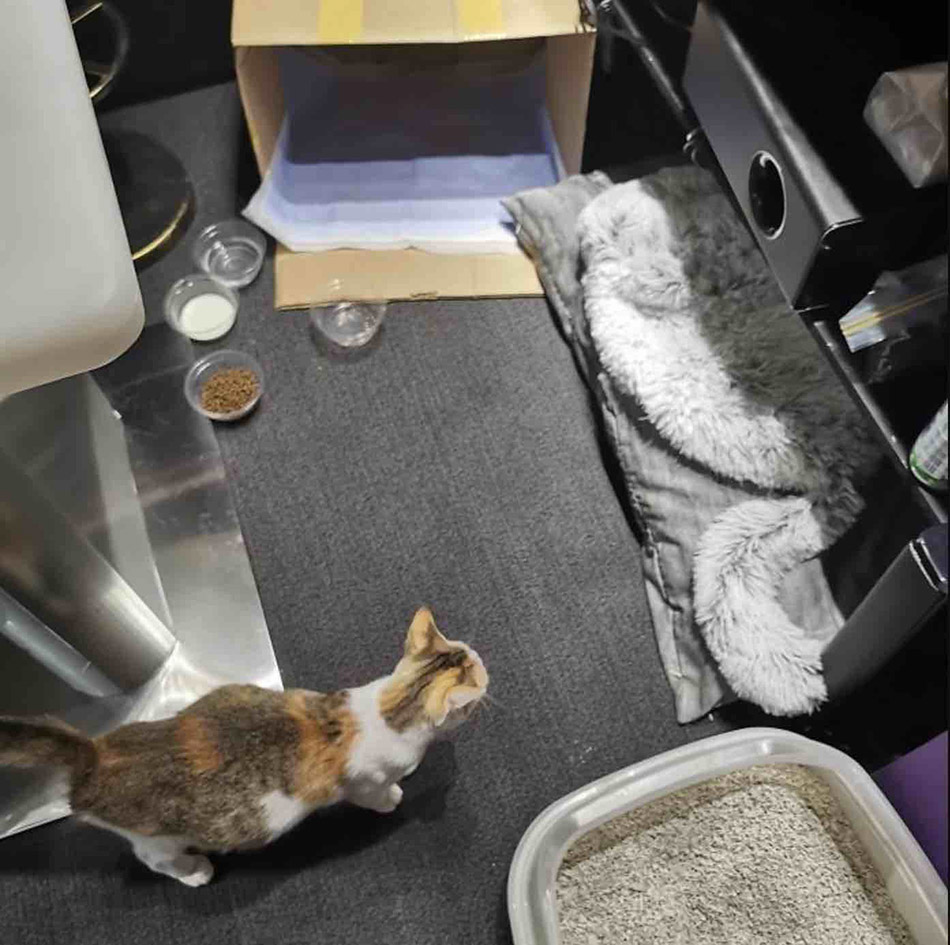 The ladies at the office decided to call her Boba, this was because her belly was so round. They put her in one of the spare meeting rooms with a lovely comfy bed, a litter box, and plenty of nourishment which included dry food, fresh fish, tuna and milk.