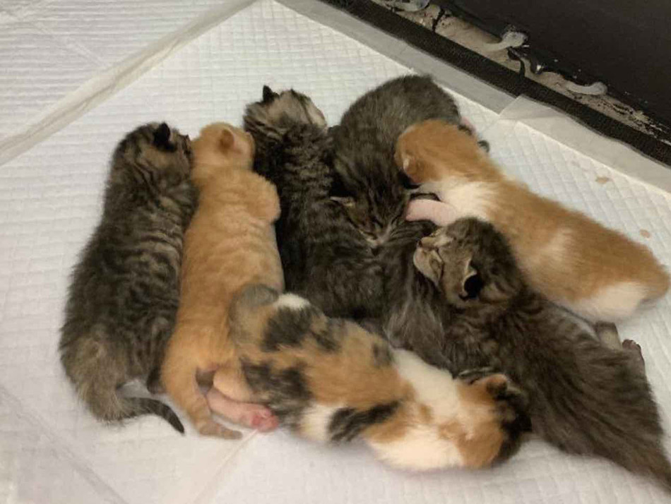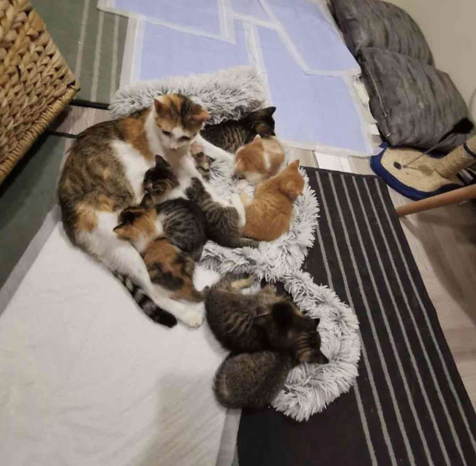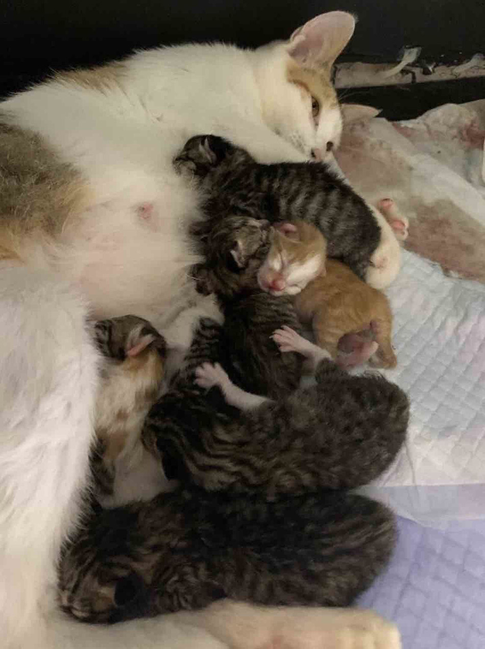 She had four boys and four girls and showed herself to be a wonderful mother despite her age. There were five tabbies, two gingers and one calico – all beautiful.