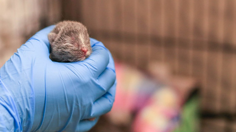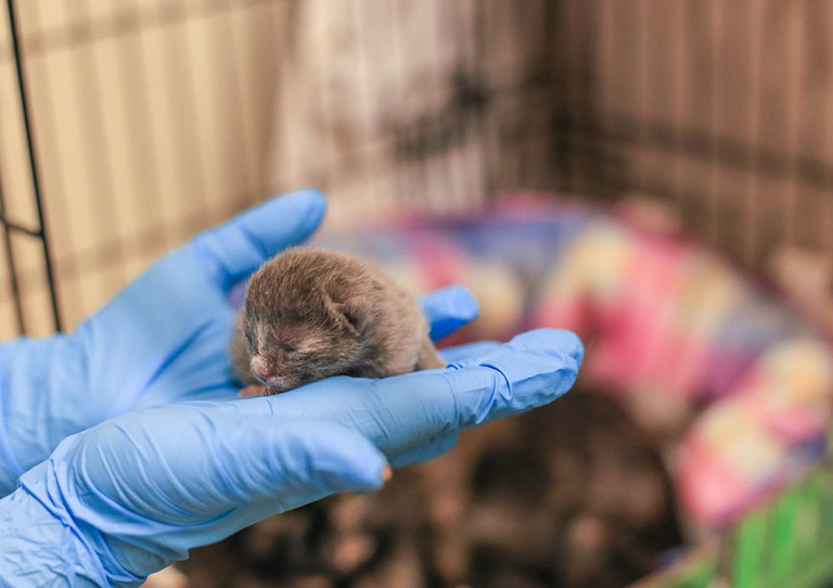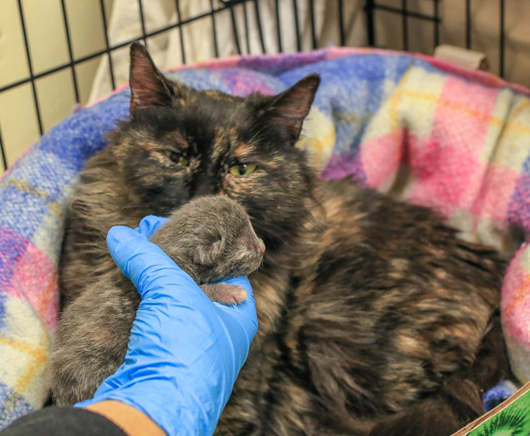 VOKRA volunteers rushed to the little family and bring them into the rescue center for emergency care. They drove as fast as they could on icy roads, to help Calida and her kitten survive.