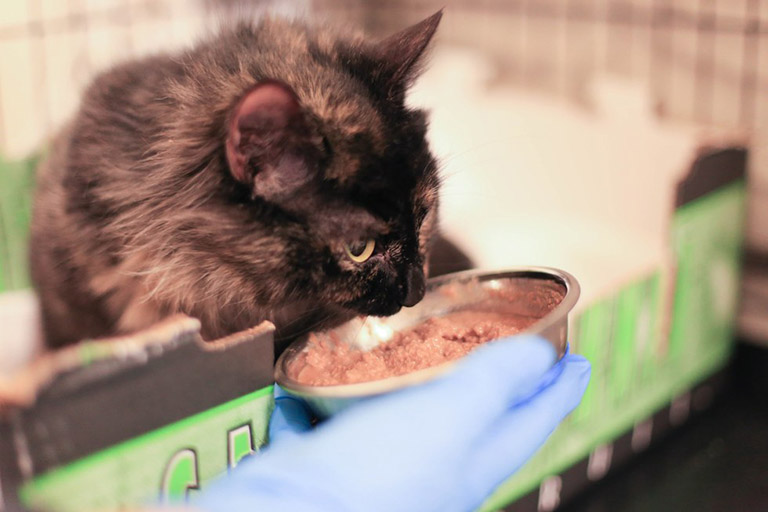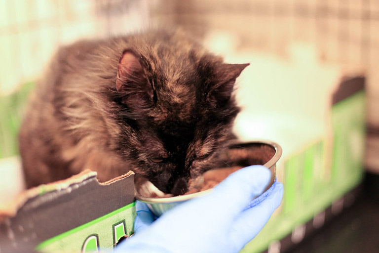 Calida was in bad shape when she arrived. She was extremely hungry, and ate with no control. Then she proceeded to rest, nurse her kitten, which is now named Sentrie.