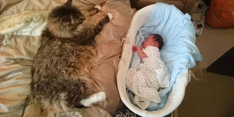 Ludo was the largest kitten in his litter and before his first birthday he weighed in at 20½lbs, but he still had a lot of growing to do. Ludo is the definition of a gentle giant. He loves watching over and protecting his human family. Here he is looking over his teeny human brother, Ryder.