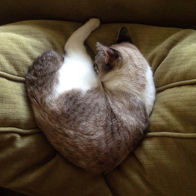 Jackie, who adopted Roux, talks about her daily routine: “Roux wakes me up every morning with what I call her alarm-meow from the foot of the bed. Then she alternates napping and playing throughout the day with two older four-legged cat sisters, Kona and Graybee. The girls spread their toys all over the house during the day. Later, her meows announcing dinnertime are very loud, and she is quite the voracious eater. After dinner she takes a long bath and usually has a few bursts of playful energy before bedtime. As her day comes to a close, I either carry her or she jumps onto our bed herself to snuggle and curl up to sleep.”