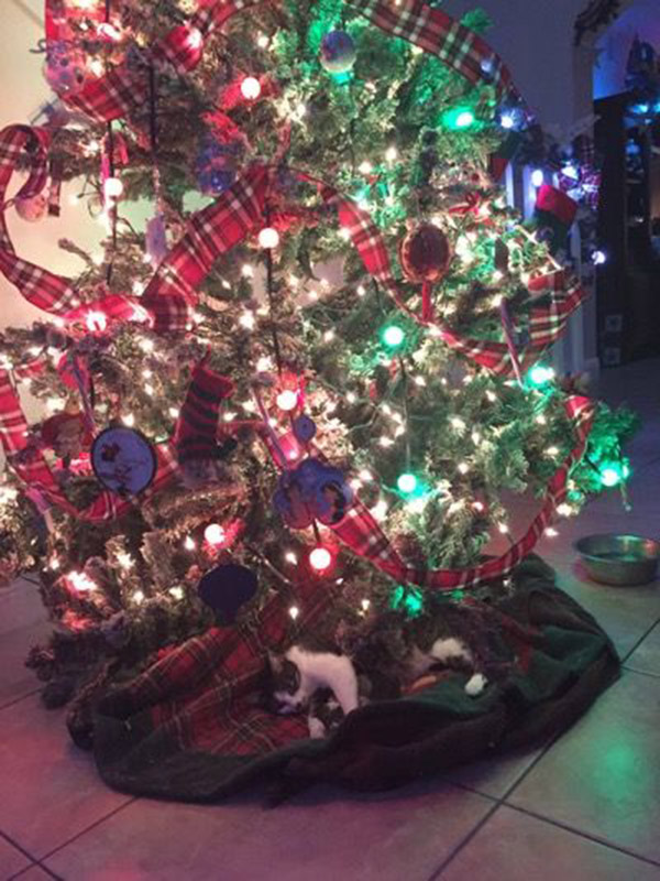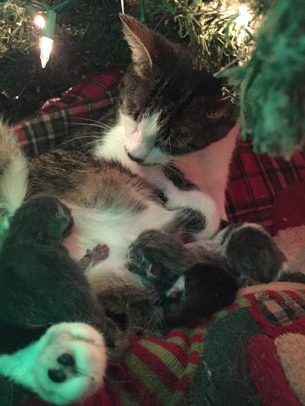 It would appear that Danielle’s male cat Sagwa and Tink decided that it was time for more cats in the family, and before long, Danielle was in for a surprise. She walked into the room to find Tink having kittens beneath the family’s Christmas tree. The four kittens were aptly named Noel, Joy, Christmas, and Faith. Sadly, a fifth kitten was stillborn.