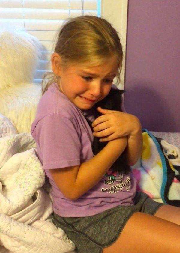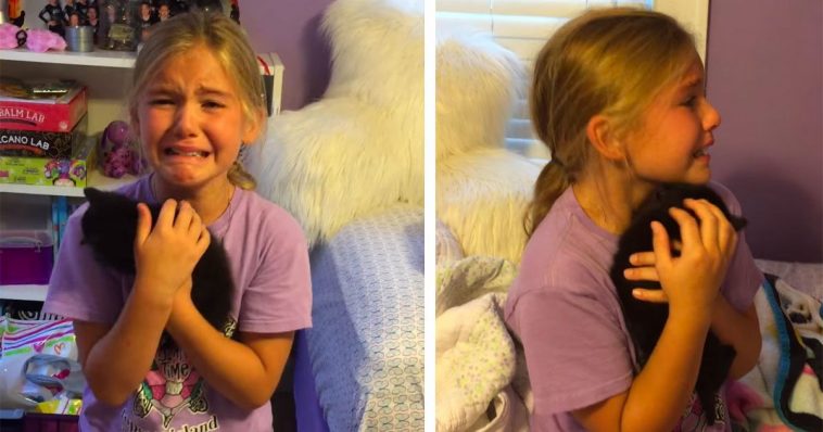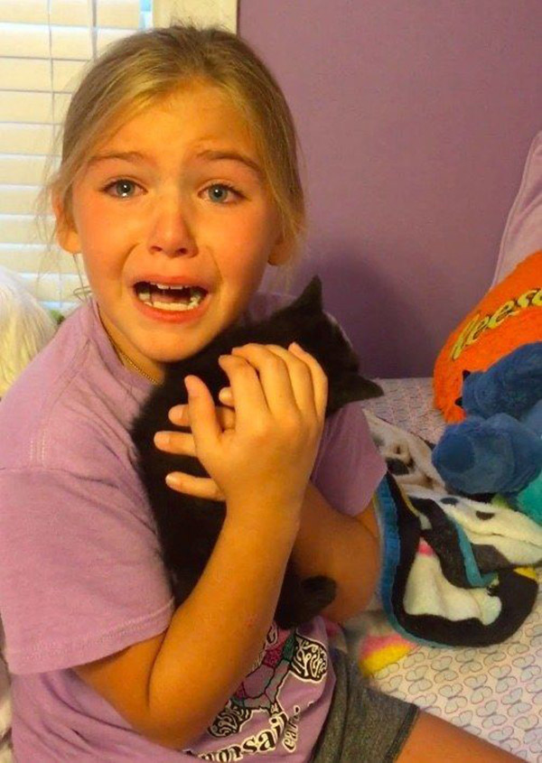 A nine-year-old girl cried tears of joy when she came home from a friend’s house one day and found a tiny black kitten in her bedroom.