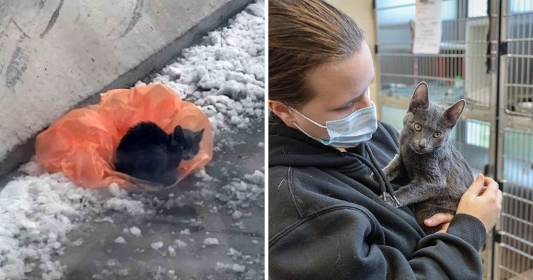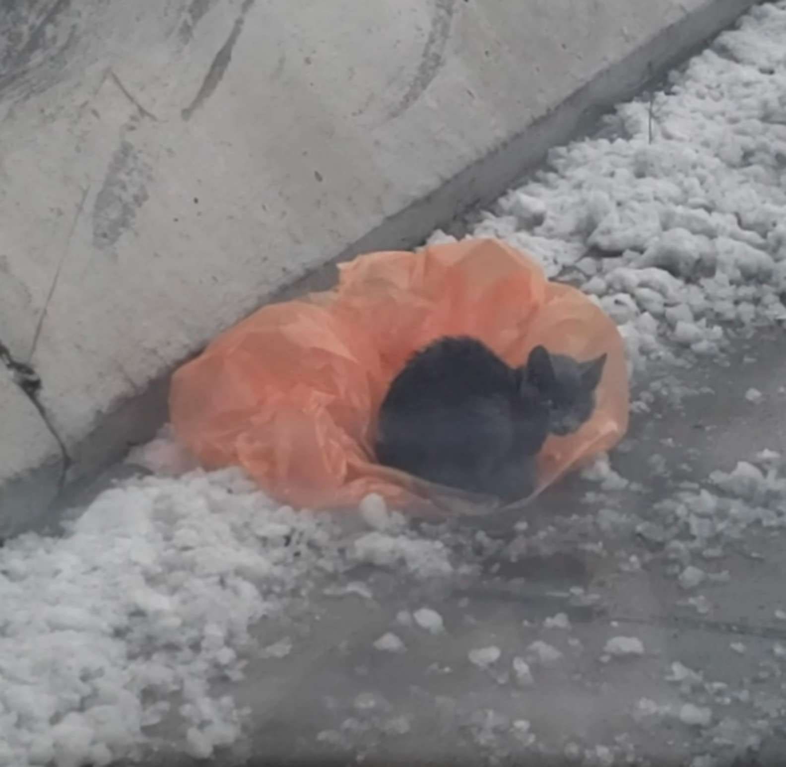 Tiffany, a field agent for Michigan Humane, was driving when she saw a small gray animal shaking near the freeway median. She got closer and spotted a kitten huddled on an orange plastic bag in the snow and sludge.
