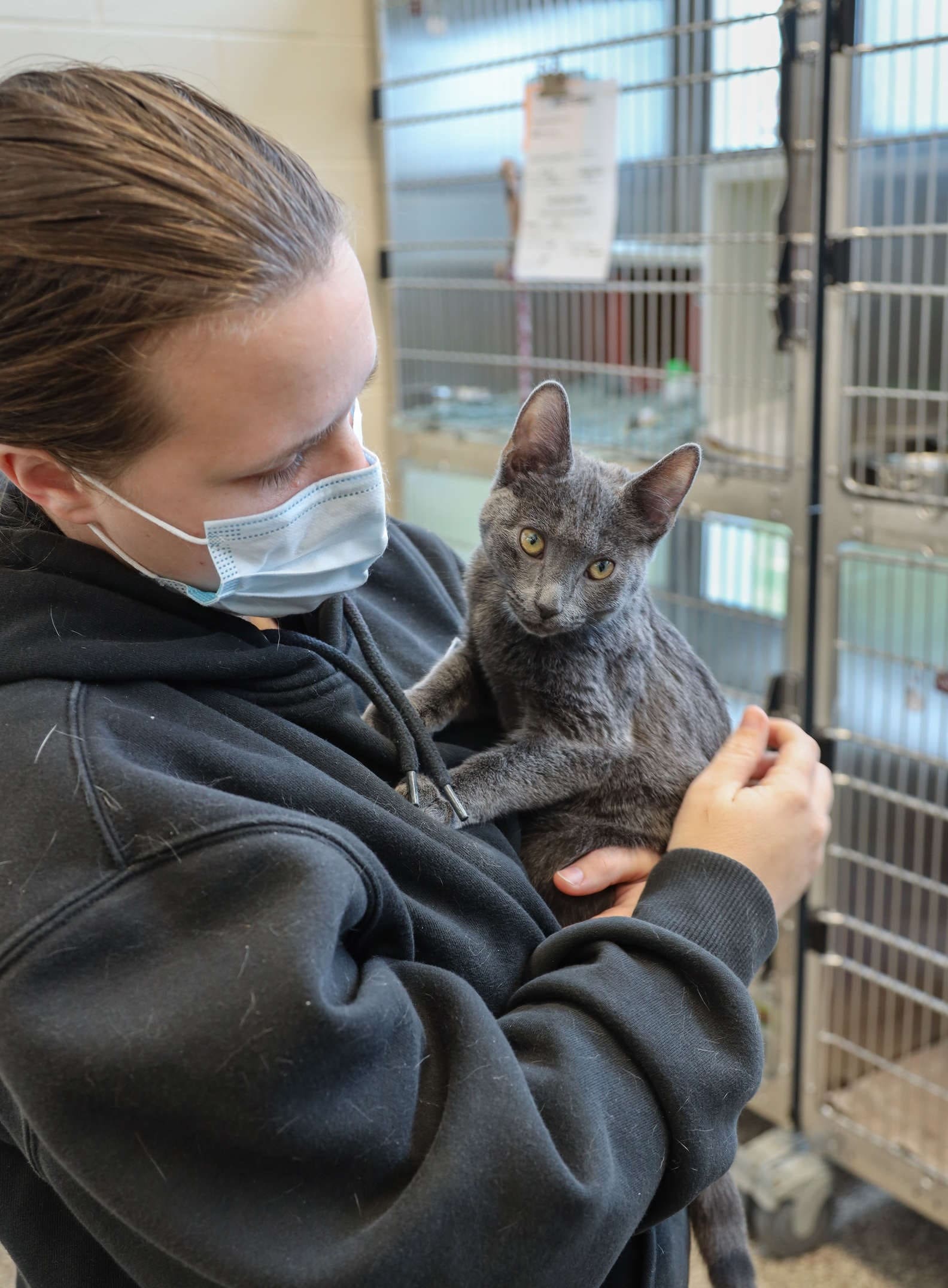 The 4-month-old shorthaired cat, now named Lodge, has large, expressive eyes that make everyone at the Detroit shelter fall in love with him. When the cat realized that he was safe, his personality began to shine. He is a snuggle bug who loves to be held and cuddled.