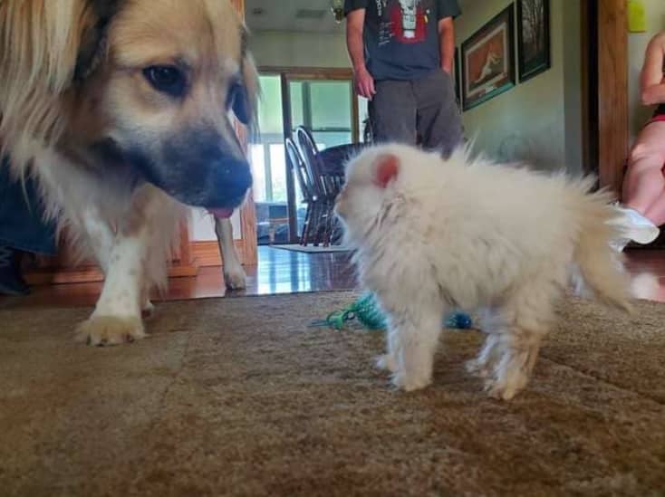 When she met her new siblings for the first time, Nimbus held no emotions back. The tiny floof was rattled, but they got along well. Sam’s dogs and cats are loving siblings and Nimbus is definitely brave. After a few days, they became best new friends.