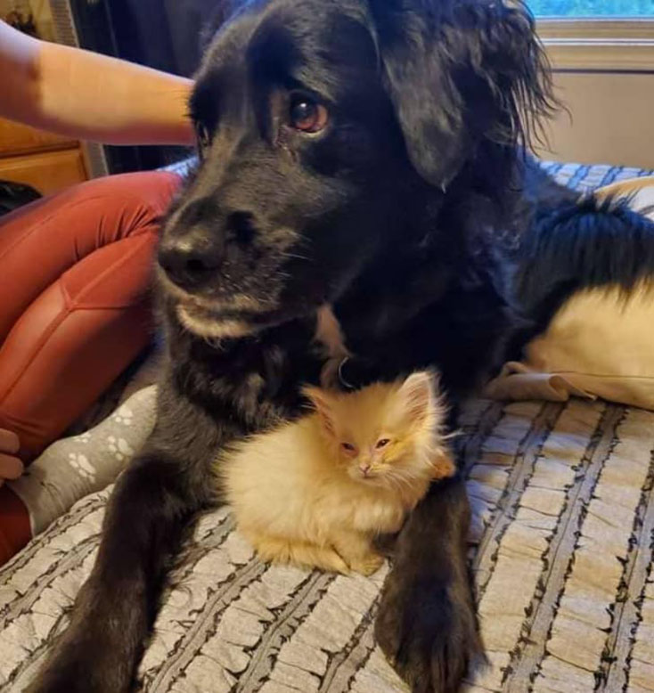 One of the dogs, Zep, loves to cuddle with Nimbus all day long. After becoming a new member of the pet-friendly family, Nimbus is living the life of her dreams. Just like she deserves.