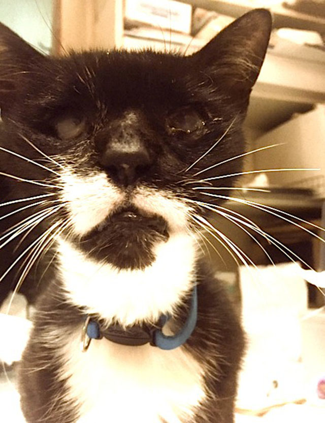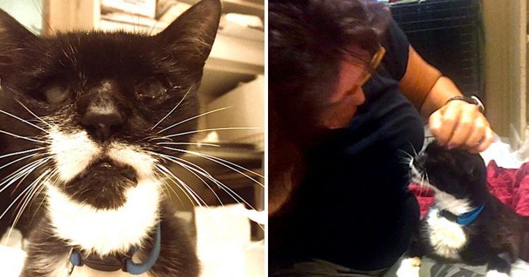 Sir Whiley Kitty is a 13-year-old stray tuxedo cat who is unfortunately, completely blind — and it’s a miracle he’s still alive.
