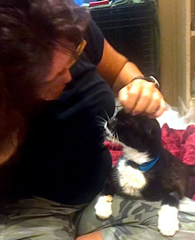 Minnich is fostering Whiley as he gets better, but she can’t keep him. “My hope is he finds a real home to transition to, where he can settle in peacefully and permanently.”