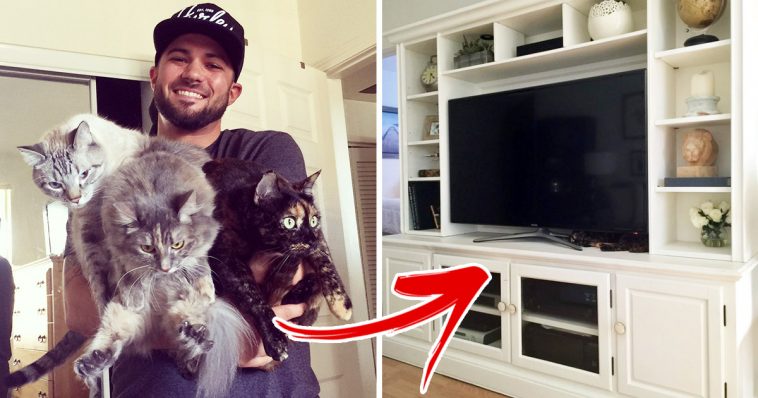 This man bought an entertainment center for himself, but soon realized that his cats loved it more. So, it clicked in his head, that he could transform it to serve two purposes instead of one. He repainted it, just to refreshen it. And, then he cut out holes from the bottom cubby into another. He then took the doors off the two center cubbies, leaving the doors on only the outer two cubbies. The section without doors were their beds. The ones without doors, had litter boxes inside, so they can go in through the holes, and do their business in private.