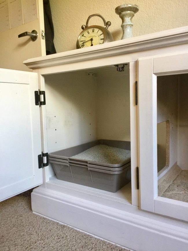 After brightening it up with white paint and removing the top, he realized that he could modify the bottom storage for his feline companions.