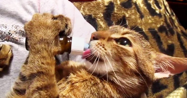 As you can see in the video, his loving owner holds him in her arms and gives him some milk from a bottle and his reaction is absolutely adorable. This particular cat makes us burst out laughing because of her unusual meowing. And it’s quite cute how she hold the bottle with her tiny paws all by herself.