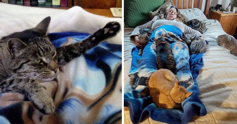 Normally, the cats don’t like to cuddle with their mom at the same time. But when they realized she was sick, they knew they had to do something to help mom. All of them cuddled up with her, trying to comfort and make her feel better.