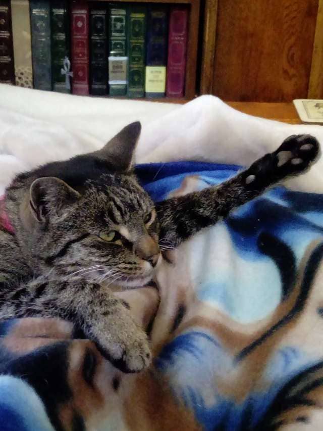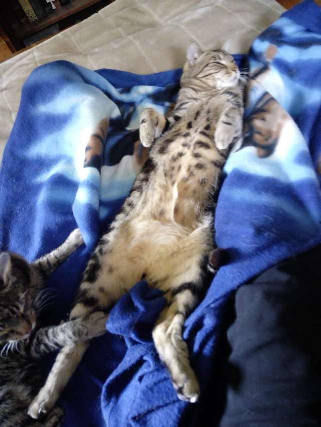 “I was resting with all of them with me. I had been very tired and it was unusual for all of them to be with me as there is a little cat politics between a couple,” Clay said. “But I felt super chilled with them around me.”