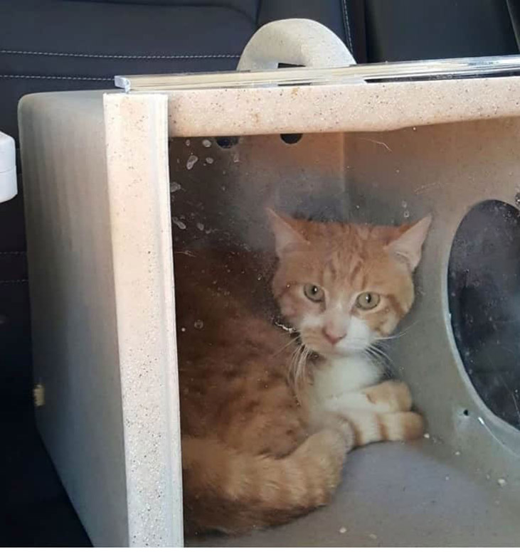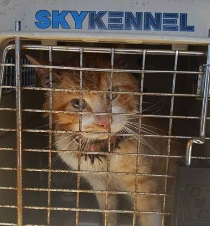 The cat was clearly afraid of humans, so it took a while before he was caught. They first laid a trap with the cat hidden under a car. The rescuers waited for an hour, but eventually decided it was better to catch the cat with a net. It was a success after a long fight and then he was off to the vet.