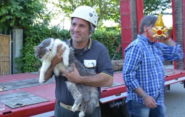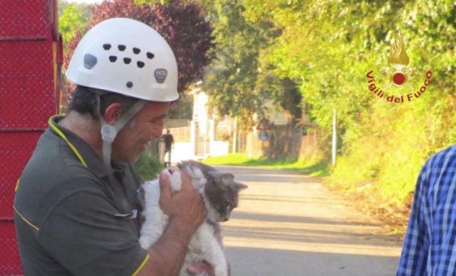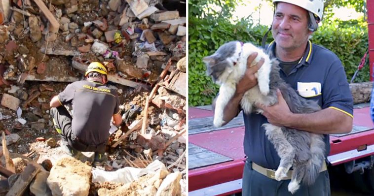 When firefighters of Vigili del Fuoco were cleaning up the rubble caused by a 6.2-magnitude earthquake, they were surprised to hear faint meows. They continued to sift through the debris and found a gray and white long-haired cat trapped among the stones inside a collapsed house. Amazingly, the cat was still alive after 32 days being trapped under the rubble.