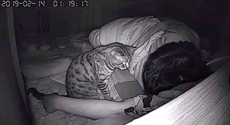 Lomphonten recently struggled to breathe every night, so he decided to set up a camera to record what was happening as he slept. After he reviewed the footage, he found out that his cat Achi loved to curl up next to him all the time. After climbing on his chest and confirming with a paw that he’s indeed asleep, Achi has made himself comfortable on his master’s face, suffocating him with love.