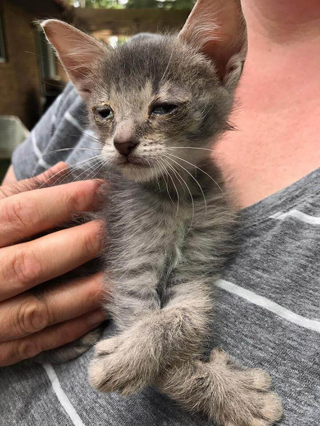 The woman heard some noises and she rushed to check. She saw the little kitten wandered in her yard asking for some help. She immediately brought him inside and then took him to the nearest vet’s office. The vets said that Scooter was born with shortened ligaments in his feet, which is what caused his feet to turn in. Also, they found that he had a respiratory infection along with his eye infection.