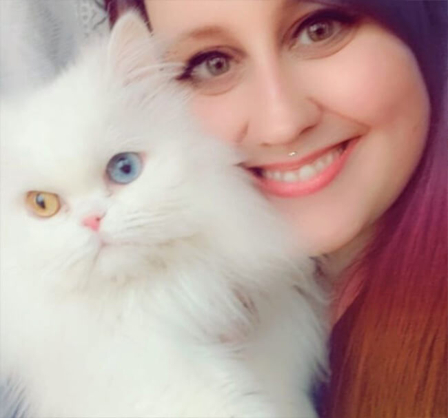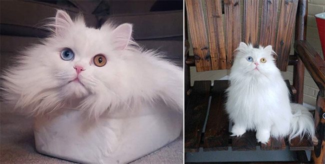 Meet Clarabelle, a beautiful cat who was rescued from a dumpster and now lives a comfortable life in a loving home with her kind owner, Cristina Kintner. She is an adorable cat with a pure white coat and two different-colored eyes (blue and yellow), but sadly she is deaf.