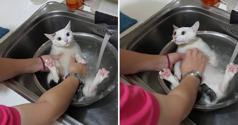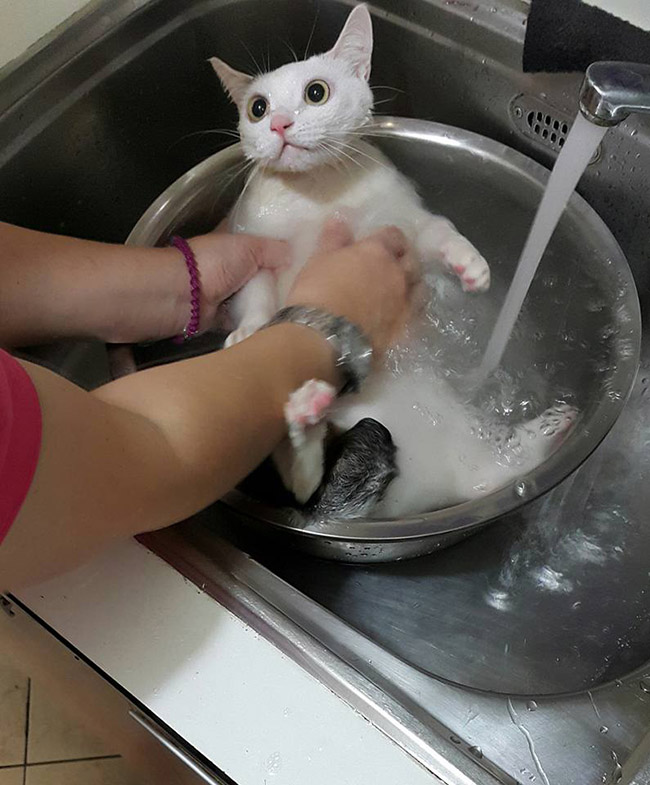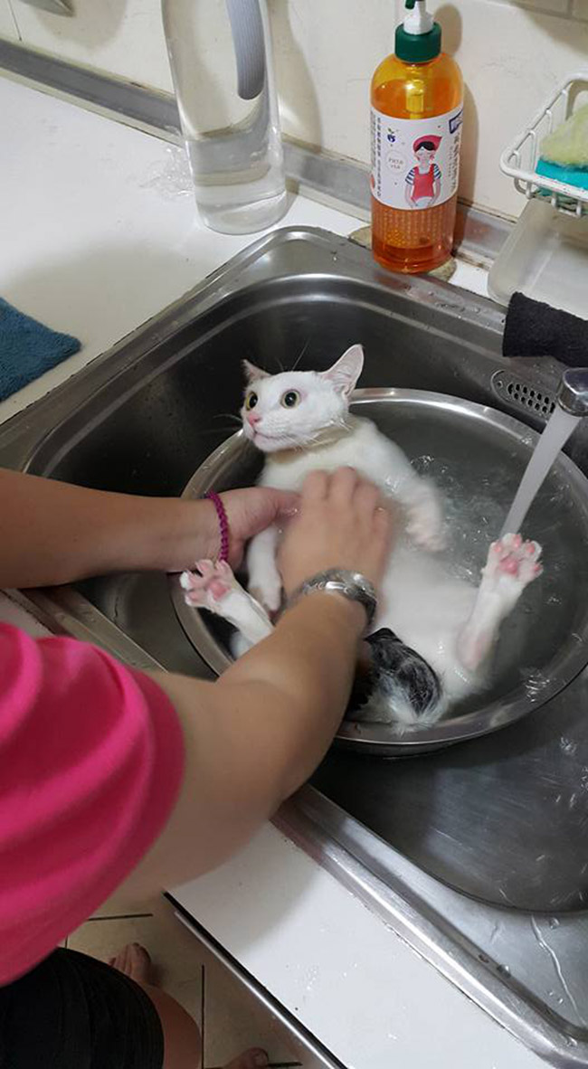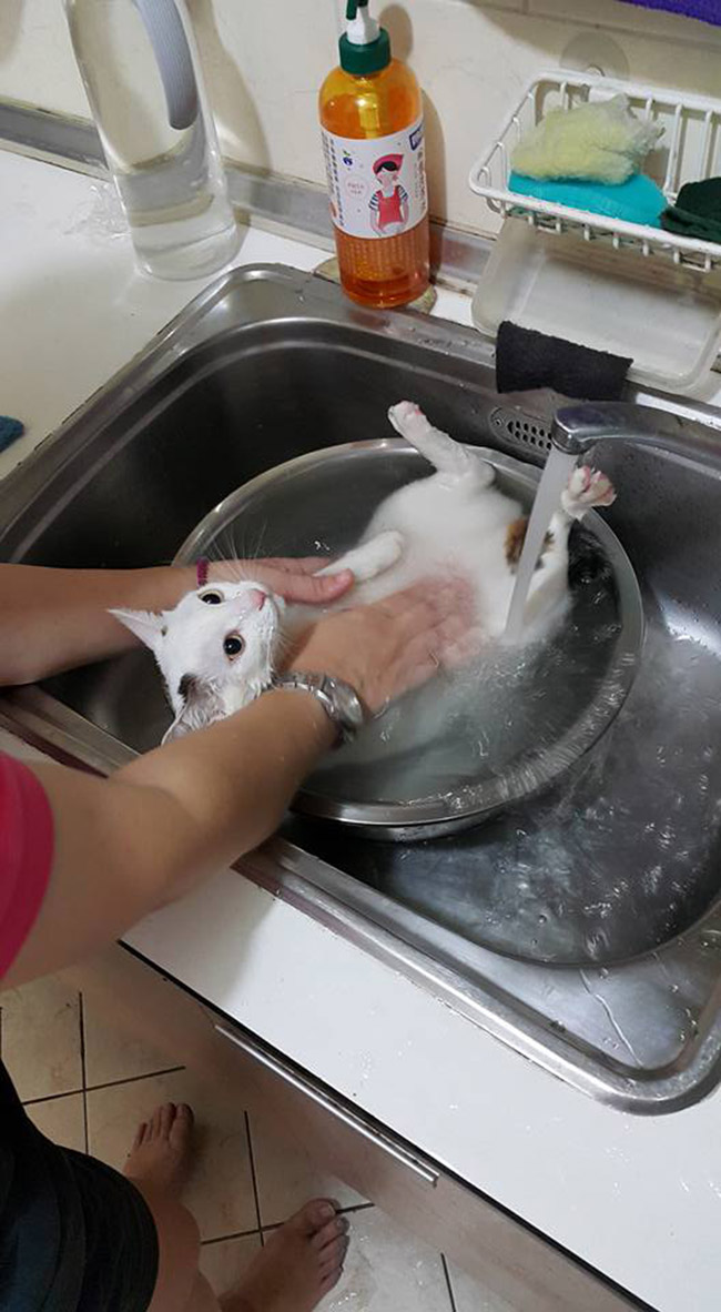 Miss Liao never had any difficulties in bathing her as the cat really loves it. Mimi the cat is not even fussy when bathing. She just needs a sink and a large bowl to bathe in.