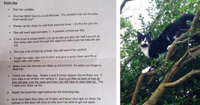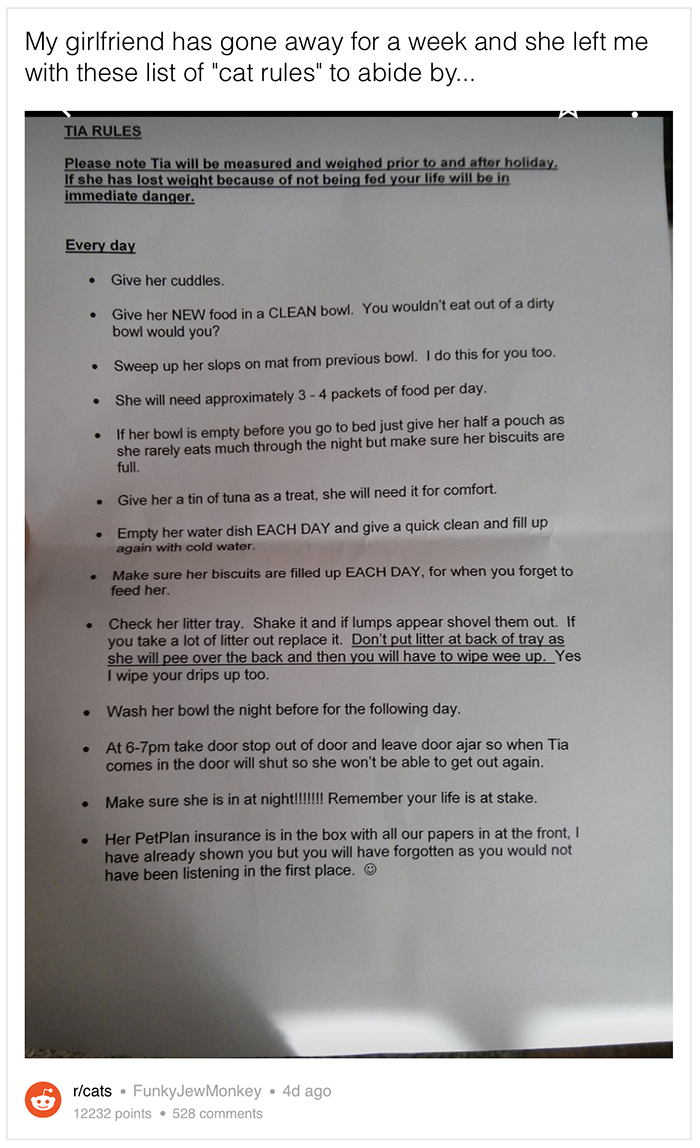 This girl is serious about the care of her cat. Therefore, before she prepared to go away for a week, she did what many doting pet owners would do — she wrote out instructions for her cat sitter – her boyfriend.