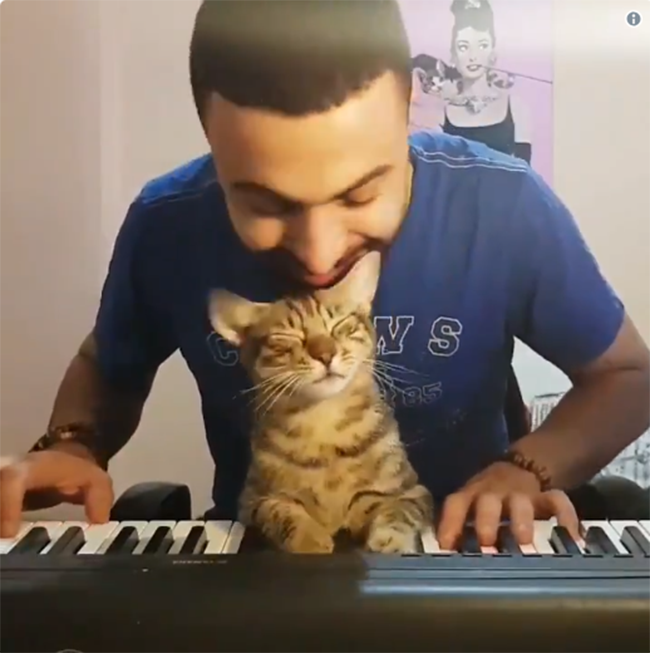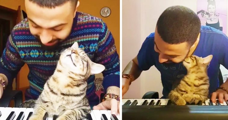 In the video, his happy cat is tucked between his arms while sitting on his lap. The cat’s arms put onto the piano keys and enjoy its owner’s music. Sometimes the cat looks up and snuggles with its owner in an effort to support and love him.