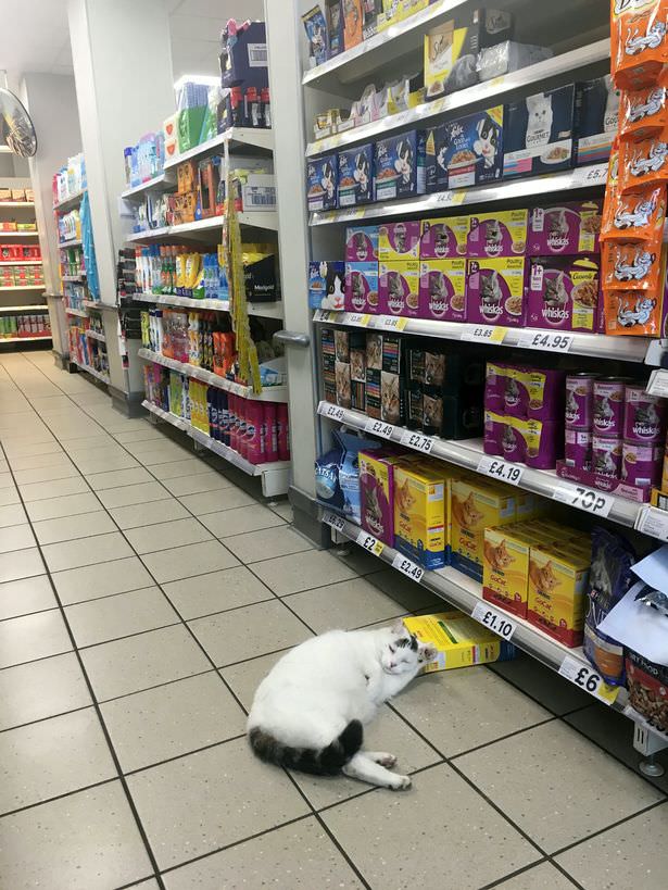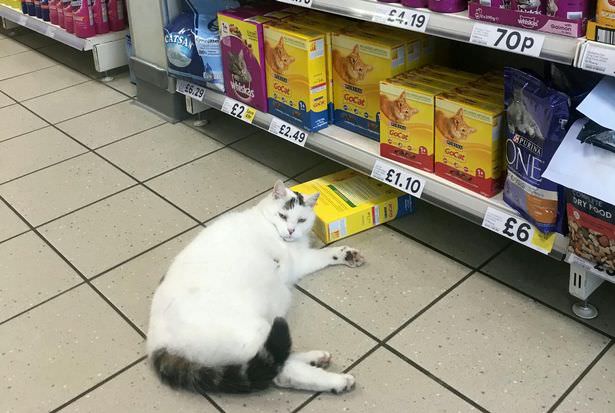 Last Wednesday, a fat white cat was spotted by shoppers in a Tesco Express store looking for food. He walked right into the shop around 9am and headed straight for the pet food aisle. Once in the pet food aisle, the white cat with a black tail knocked-over a box of Go-Kat biscuits before taking a nap next to them.