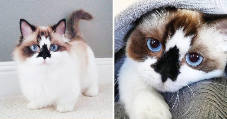 Meet Albert, a Munchkin cat with short legs. He’s an Instagram famous munchkin cat with beautiful blue eyes and adorable attitude. He has a very skull-like nose (which we also think happens to look like a Christmas Tree) a triangular patch of black fur in the middle of his face that looks like the nose area hole in the middle of a skull.
