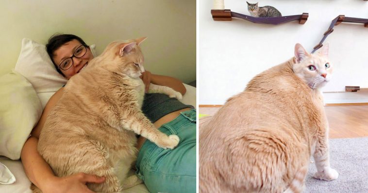 After bringing Bronson home, they took him to the vet. The most important thing is to have to loss weight for him, or else he can get Fatty Liver Disease, which can be a fatal illness. They have adjusted Bronson’s diet three times since they got him. They’ve also changed his exercise routine a few times. At first, he was playing with toys with him laying down for about 20 minutes a day and also carrying him downstairs so that he needed to climb back up to get to his favorite napping spot.