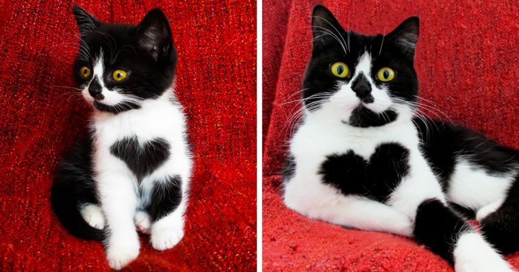 Meet Zoë, a cat who was born with a heart shaped patch of black fur on her chest. She along with her sister Izzy was adopted by Joanne Smienk. At first, Joane actually adopted her sister Izzy. However, one look at Zoë and her big heart patch, and it was love at first sight and she decided to take her home. The two tuxedo feline sisters were able to stay united as they were adopted together. The feline Zoë has a beautiful fur, between her chest that is unlike any other. Her longer coat has earned her the nickname ‘The Fluff’, though she also goes by ‘Queen Of Hearts’.