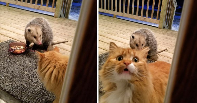 We 100% sympathize with the cat in the story that Imgur user MrRogers247 shared. Just look at that face of ultimate rage and despair. Who can even be calm when some possum eats your food like he owns the place? In fact, this is a nice kitty. Kudos to the cat for being a kind lady and not beating the possum’s ass off!