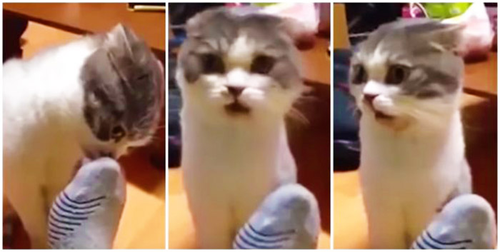 Just look at the cat’s reaction after he sniffs the owner’s feet. I think he has never smelled something more terrible than that.