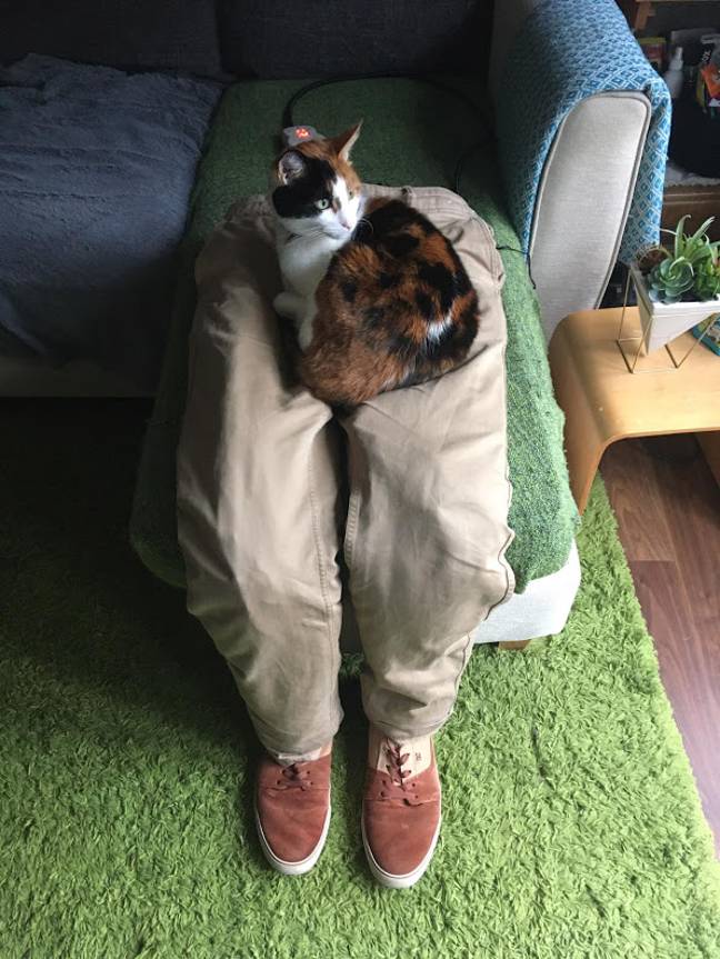 Alex came up with a clever idea to make a fake lap for Ziggy to sit on while they were busy doing other things.
