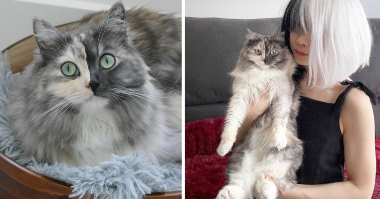 All cats, and all living individuals in general, are unique, I can give you that, but some are more unique, not because they’re superior to others, but because some individuals are more than just one individual. The latter statement might puzzle you. “What do you mean some individuals are more than just one individual? That’s elitist!” Now now, this is not what I meant at all! Actually, there’s a rare genetic condition that causes two or more zygotes to merge at the inception, making an individual a mix of two individual forming cells. The condition is poetically called “chimerism,” named after a Greek mythical creature Chimera, which was part lion, part goat, and part dragon… Actual chimerism isn’t as dramatic as in the myths, but, fortunately for us, it’s much more beautiful and wonderful to see in reality! Here’s Geri, a rare genetic specimen (or should I say specimens?) that has chimerism, and looks so cute that hundreds and thousands of fans find it hard to resist.