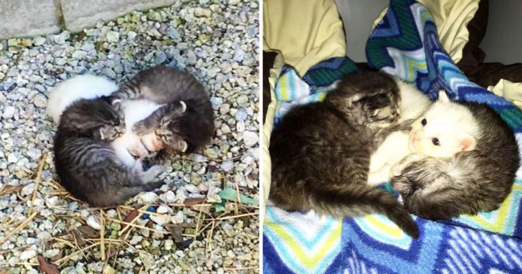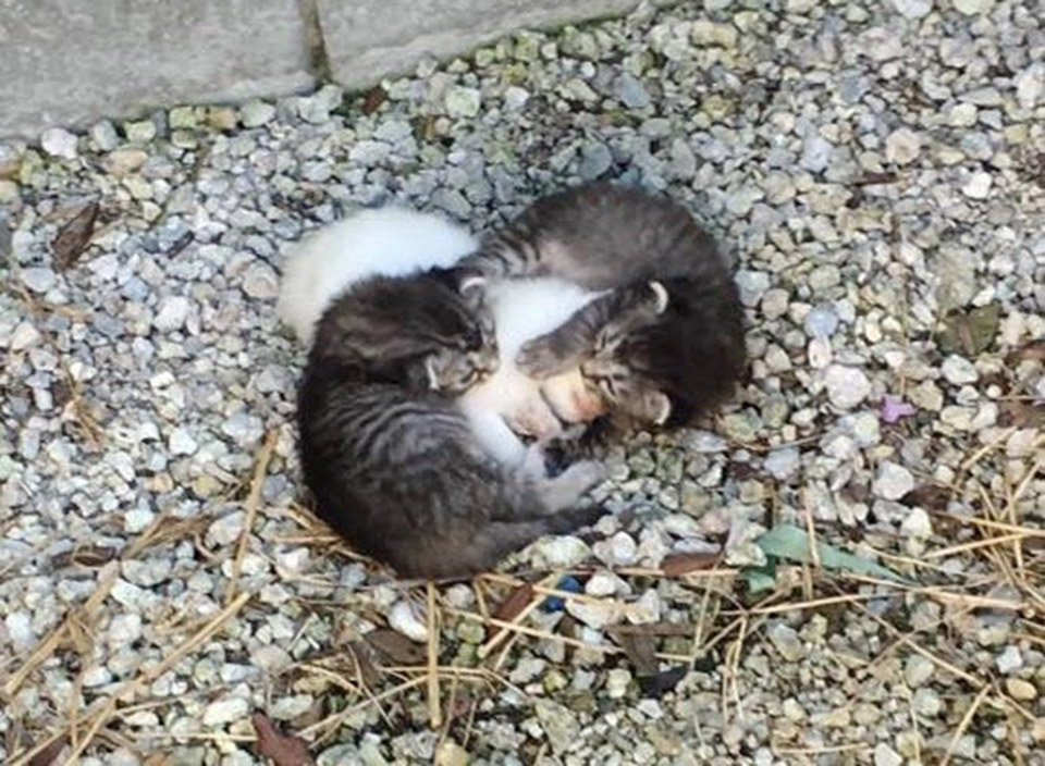 An adorable litter of three kittens were found huddling up together. Two kittens were wrapped around their tiny trembling sister. The other two were trying to keep her safe.